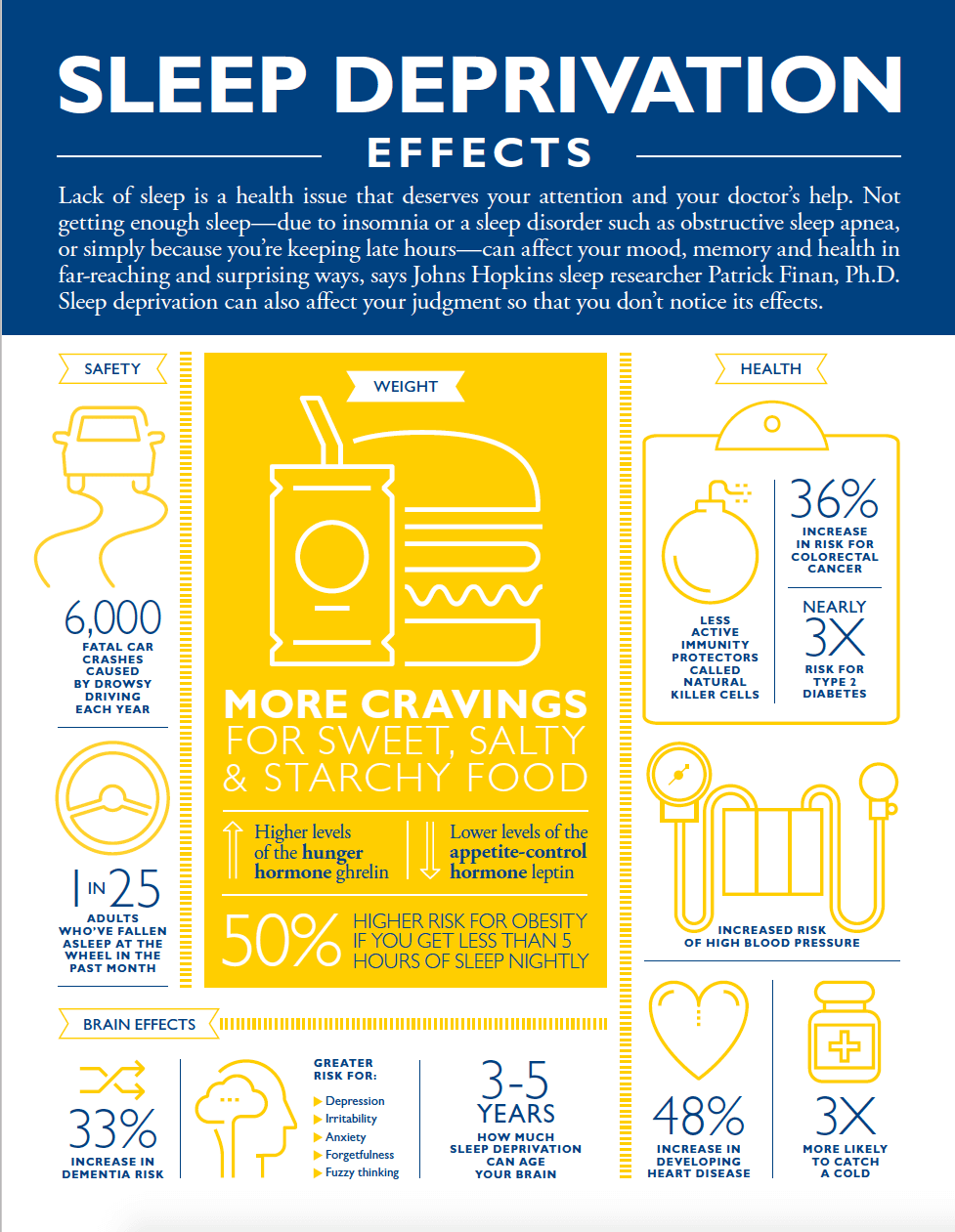 Sleep deprivation can result from a sleeping routine that is less than 6 to 8 hours daily. Some obvious signs of sleep deprivation includes fatigue, irritability, yawning and sleepiness. Moreover, sleep deprivation increases risk of early death up to 12 percent. The quality and duration of sleep on a daily basis is vital for proper human functioning. Without enough sleep, your brain and body can lose their ability to function properly.