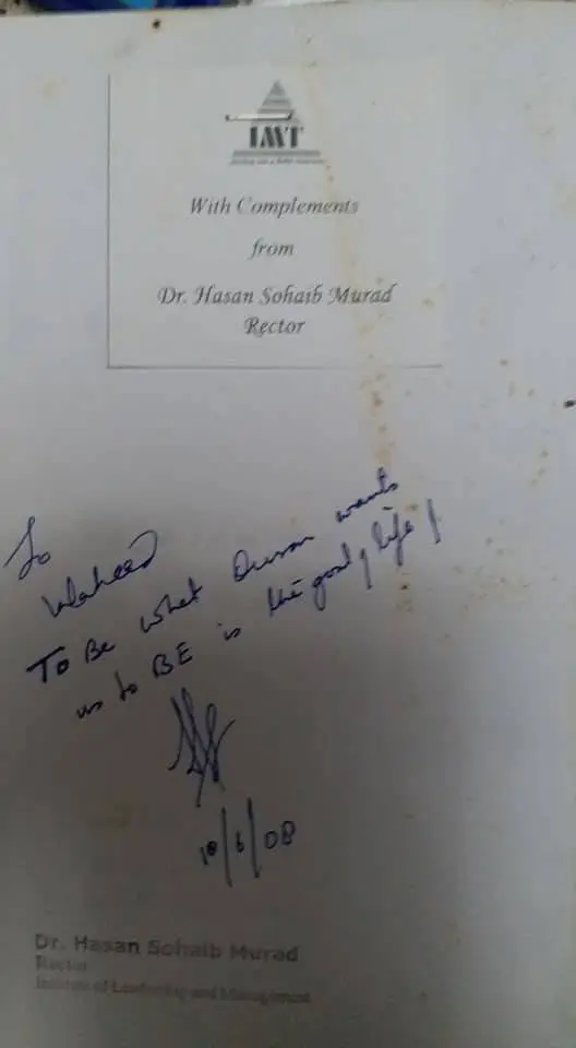 I remember meeting him a few times at NED after I joined as a freshman in April of 1980. Then shortly afterwards (in December of 1980), I transferred from NED to join the Electronic program of Dawood Engineering College (now DUET). I did briefly meet him for a few more times, but then lost contact with him. It would be several years later when I was doing my PhD in USA and was visiting New Jersey in July of 1991 and was staying with Mr Farrukh Raza (who had been my class fellow at Dawood College) that I heard of him again. Farrukh told me that Mr Hasan Sohaib Murad had started an institute by the name of ILM in Lahore a year earlier and the Institute seems to have a lot of promise. I would also hear about the institute from others who hailed from Lahore during my stay in USA. They would tell me to go and check it out after my return!