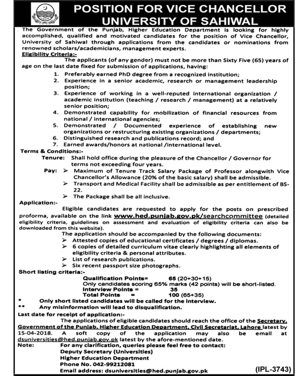 The Punjab government has initiated the process of appointment of vice chancellors at public universities in the province, beginning with Punjab Higher Education Department (HED) advertising a request for applications for the vacant post of University of Sahiwal VC.