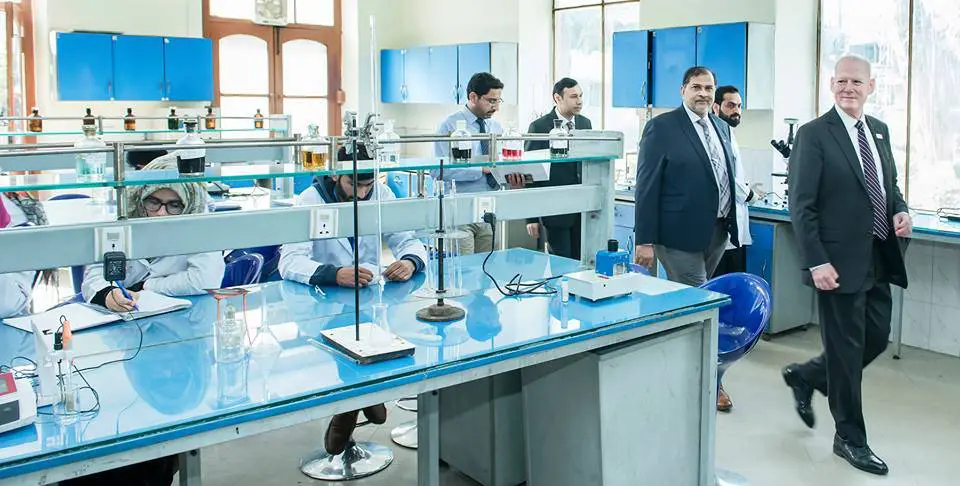 Dr Andrew T Maccabe applauded the UVAS administration for their achievements and development in a short span of time. Later, Maccabe accompanied Prof Dr Masood Rabbani to the theriogenology lab, pathology lab, parasitology lab, physiology lab, ivpd facility, microbiology labs, anatomy and histology, meat technology departments, pet centre, IBBT labs, quality operations lab, outdoor facility, university diagnostic lab, business school and the IT centre.