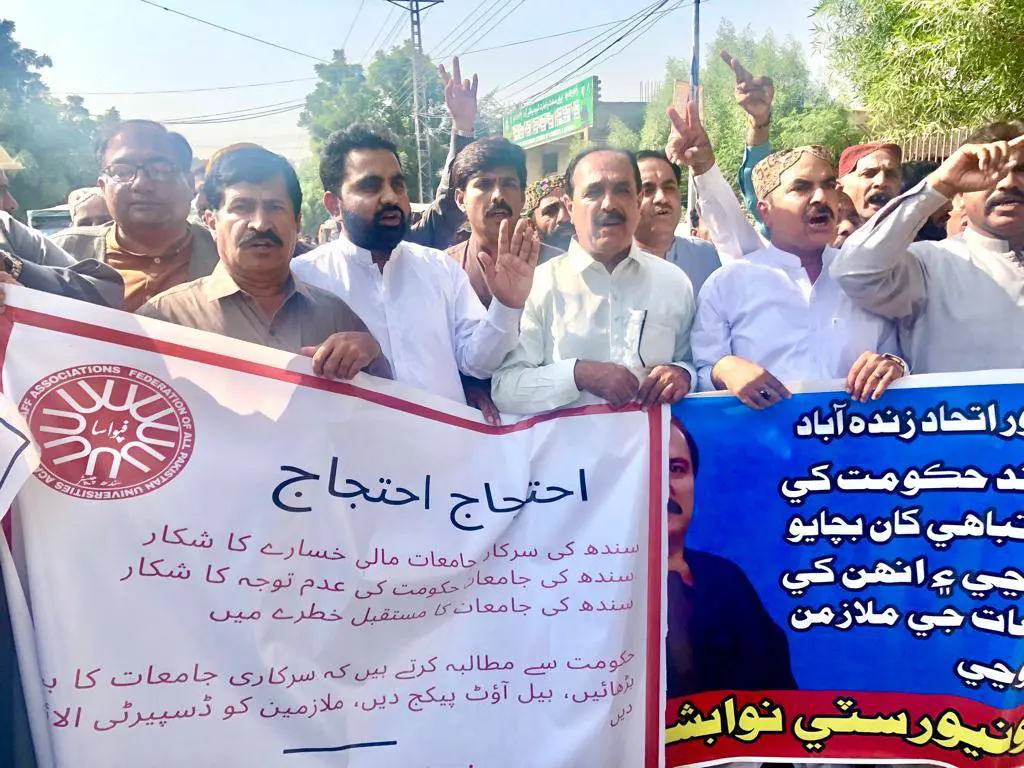 Federation of All Pakistan Universities Academic Staff Associations, Sindh Chapter demonstrated protest in front of Nawabshah Press club demanding increase in the annual budget of public sector universities and their bailout packages.