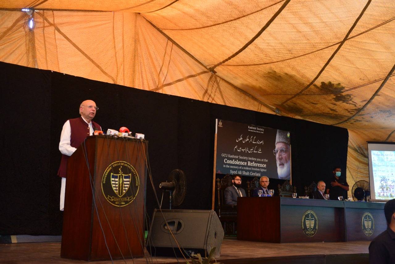 The governor was addressing a condolence reference for the late Syed Ali Geelani which was organized by the Kashmir Society of GCU Lahore. Vice Chancellor Prof. Dr. Asghar Zaidi, Dr. Syed Mujjahid Gilani, the grandson of Syed Ali Geelani, and eminent journalist Salman Ghani were also present.