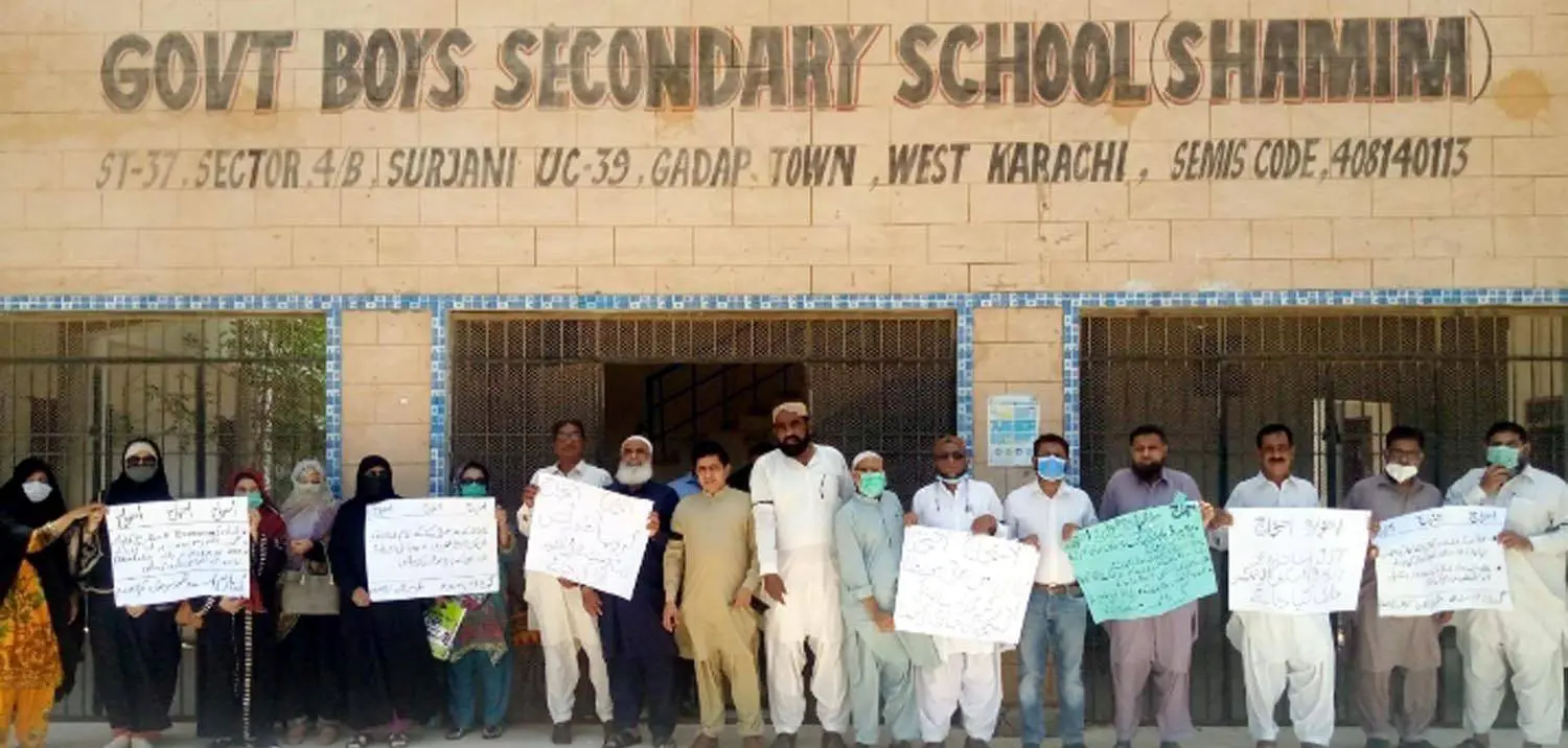 Demonstrating a protest at the Government Boys Secondary School District West Karachi, in which the GSTA Central General Secretary Abdul Hafeez Mehr, Senior Leader Masood Al Hassan, Karachi Division President Anwar Din Memon, Karachi West President Allah Bachaio Lakho, General Secretary Nordin Mastoi, Manghopir Taluka President Shafi Muhammad Channa, General Secretary Abdul Jabbar Baloch and others participated.