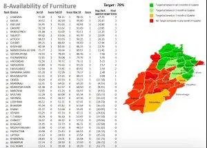 The most affected sections of the public schooling system in this quarter were the schools’ inability to retain the proscribed percentages of students in classrooms and utilizing the NSB funds during the quarter. Furthermore, it was found that more than half of the districts across Punjab did not have the furniture to accommodate enrolled students.
