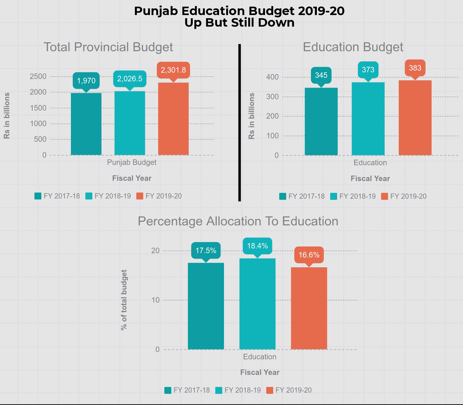 When considered against the 2017-18 budgetary allocations approved by the PML-N’s provincial government, education again seems to be at loss. The PML-N government allocated Rs 345 billion or 17.51 percent of the total budget of the province to education in fiscal year 2017-18. This means the allocation for allocation was 0.87 percent more two years ago than what it is this fiscal year.