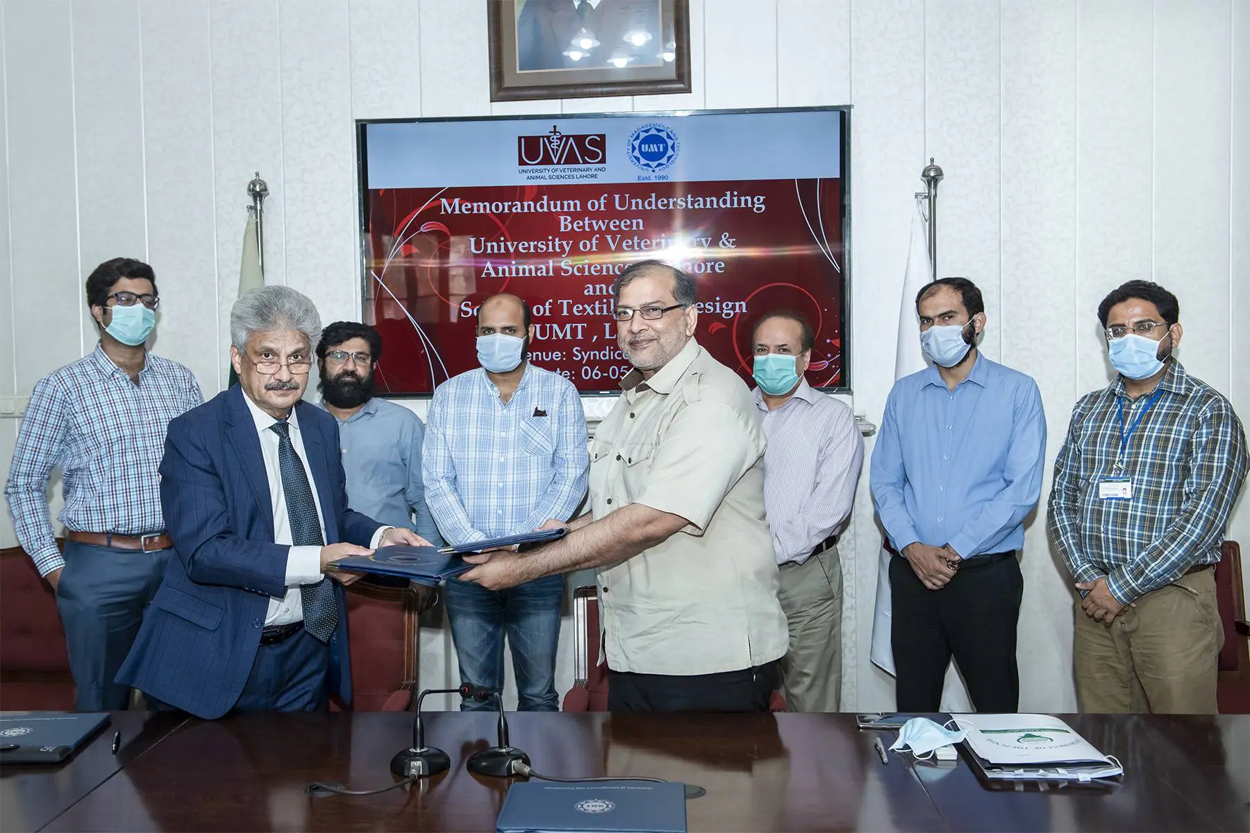 UVAS Pro-Vice-Chancellor/Dean Faculty of Veterinary Science Prof Dr Masood Rabbani, Chairman Department of Parasitology Prof Dr Kamran Ashraf and Director Office of Research Innovation and Commercialization (ORIC) Dr Farhan Jamil from UVAS and Dean School of Textile and Design Prof Dr Mumtaz Hasan Malik, Associate Prof Dr Mudassar Abbas and Director (ORIC) Mr Abid H K Sherwani from UMT signed the MoU in a ceremony held at the UVAS City Campus while UVAS faculty members Prof Dr Imran Rasheed and Dr Muhammad Oneeb were present.